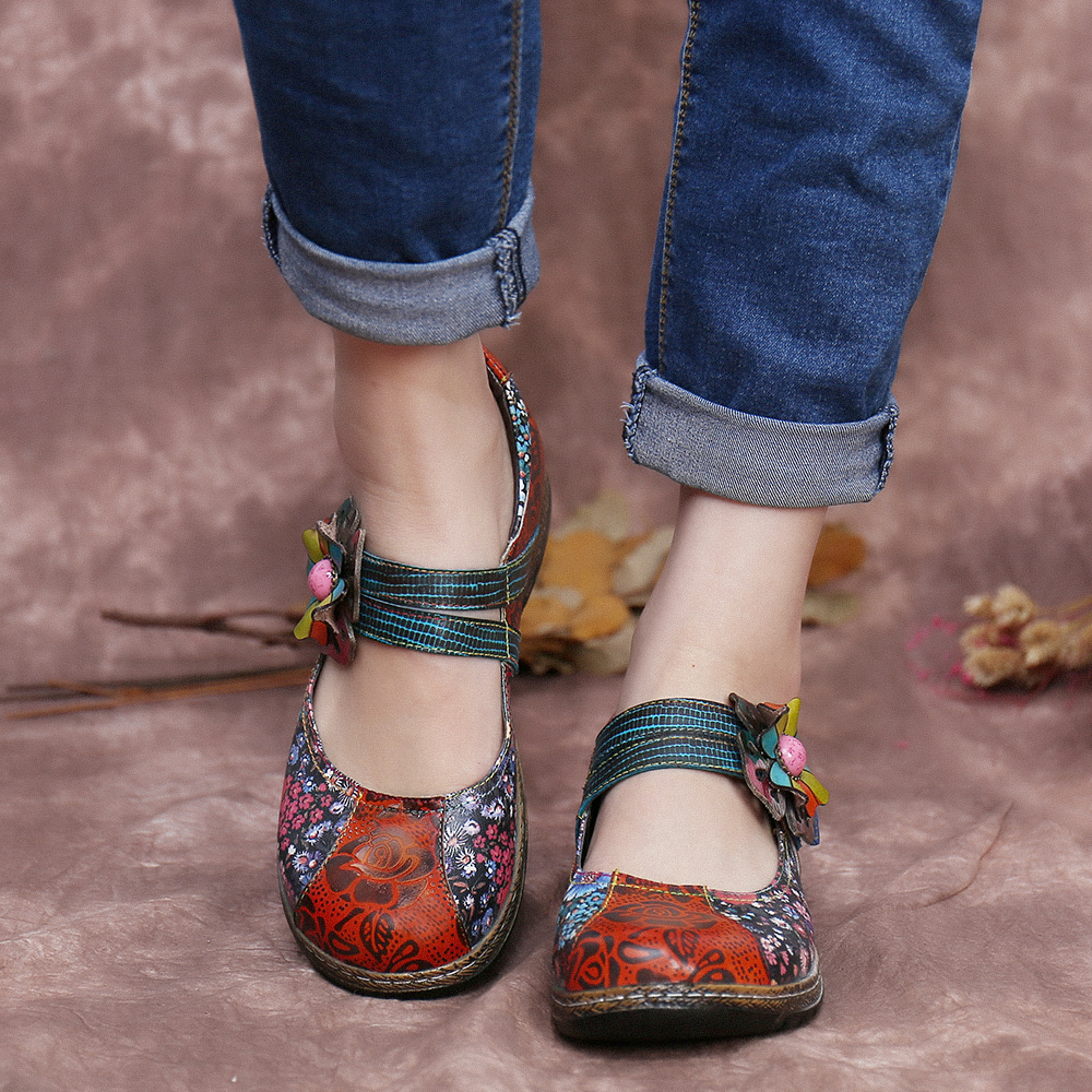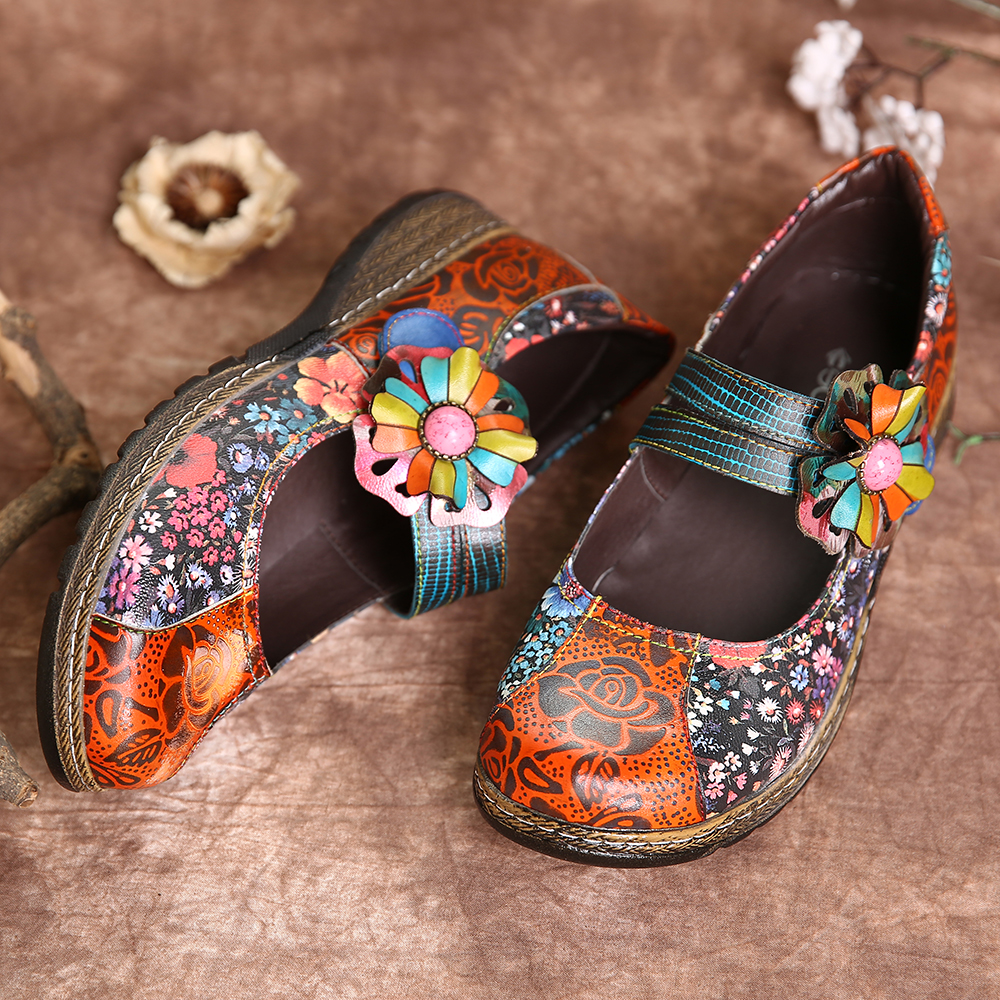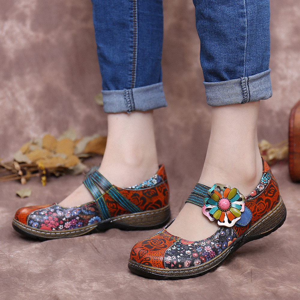 Retro Embossed Flower Splicing Floral Genuine Leather Flat Shoes