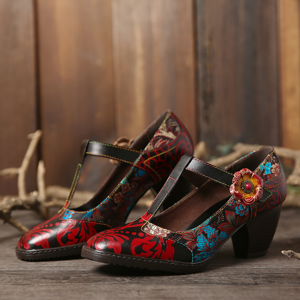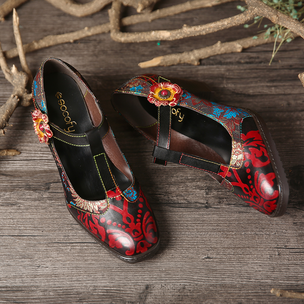 SOCOFY Retro Florals Embroidery Flowers Leather Low Heel T-strap Hook Loop Pumps