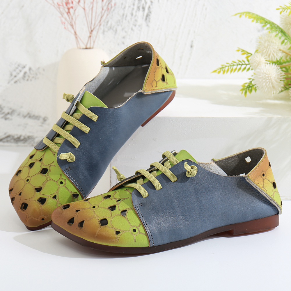Two Tone Leather Splicing Floral Cut out Elastic Strap Slip-on Soft Flat Shoes