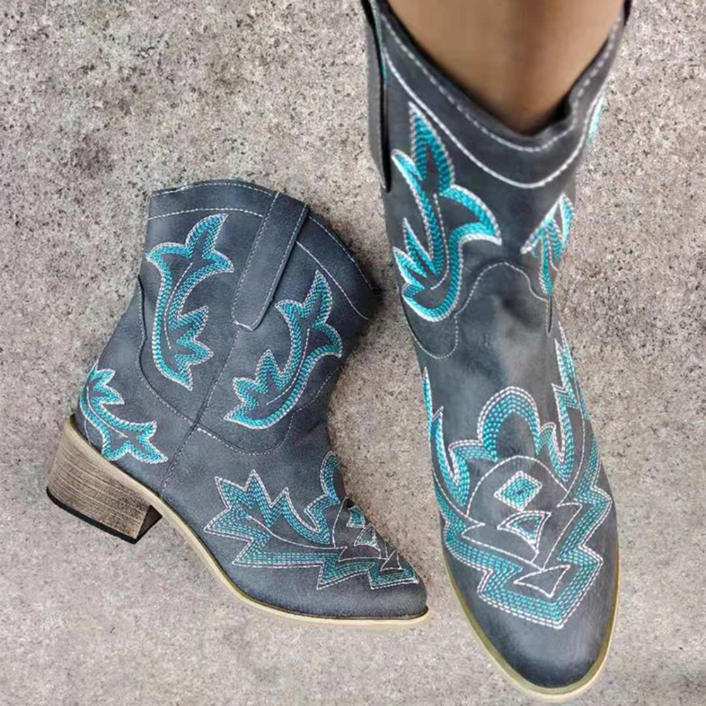 Women Casual Totem Embroidery Winter Warm Pointed Toe Mid-Calf Cowboy Boots