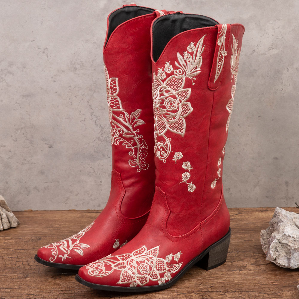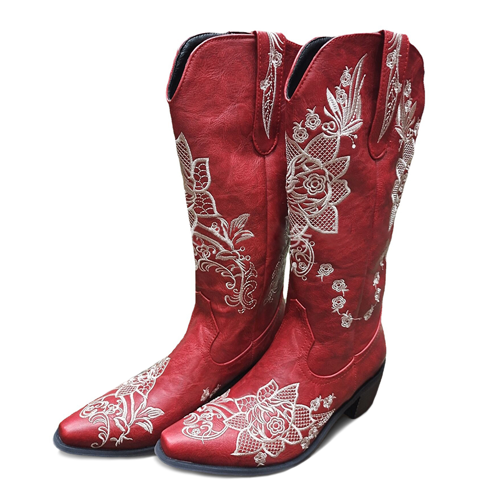 Women Floral Retro Pointy-toe Embroidery Leather V-Cut Chunky Heel Mid-calf Pull On Knight Boots
