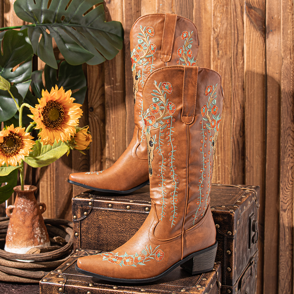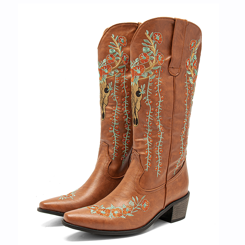 Women Retro Floral Animal Embroidery Leather Pointy-toe V-Cut Chunky Heel Mid-calf Knight Boots