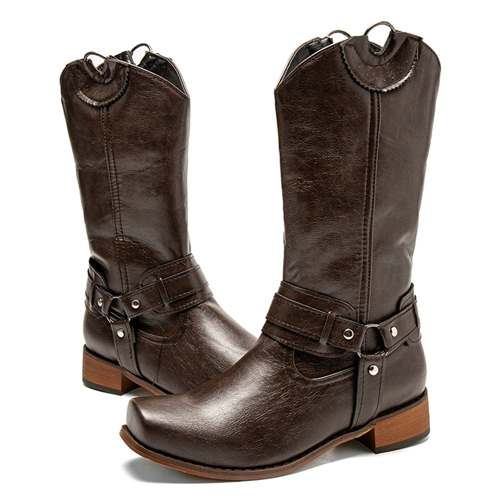 Women Retro Long Square Toe Slip-on Harness Boots