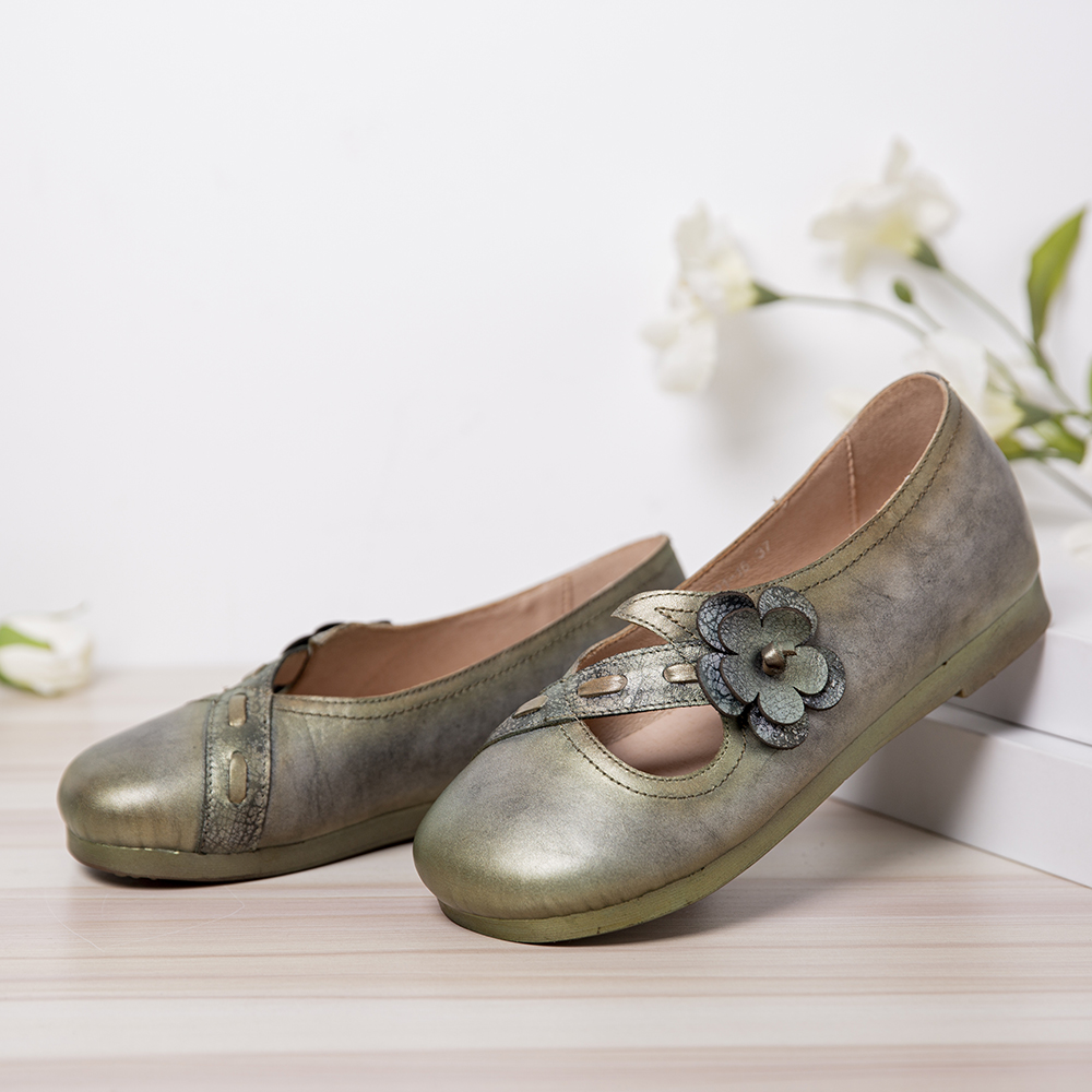 Vintage Handmade Soft Leather Floral Strap Green Slip on Flat Shoes