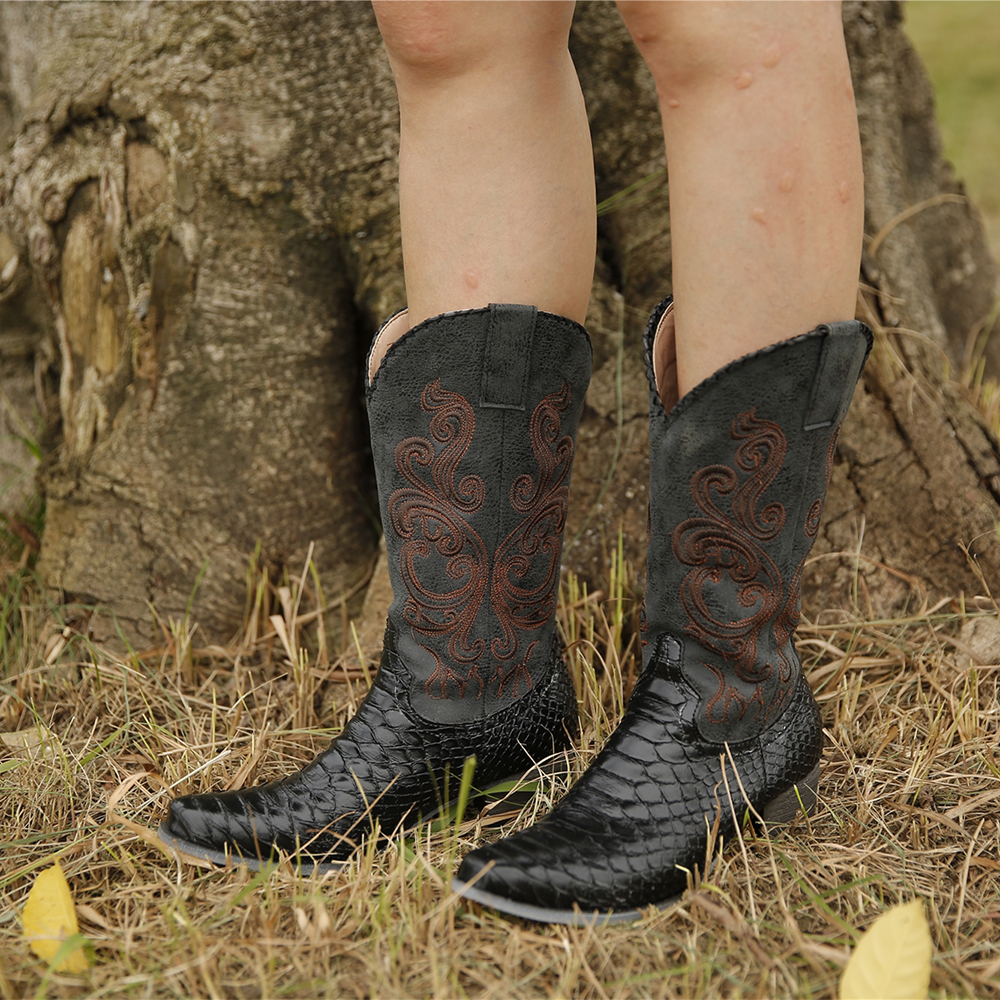 Plus Size Women Embroidered Splicing Chunky Heel Mid Calf Cowboy Boots