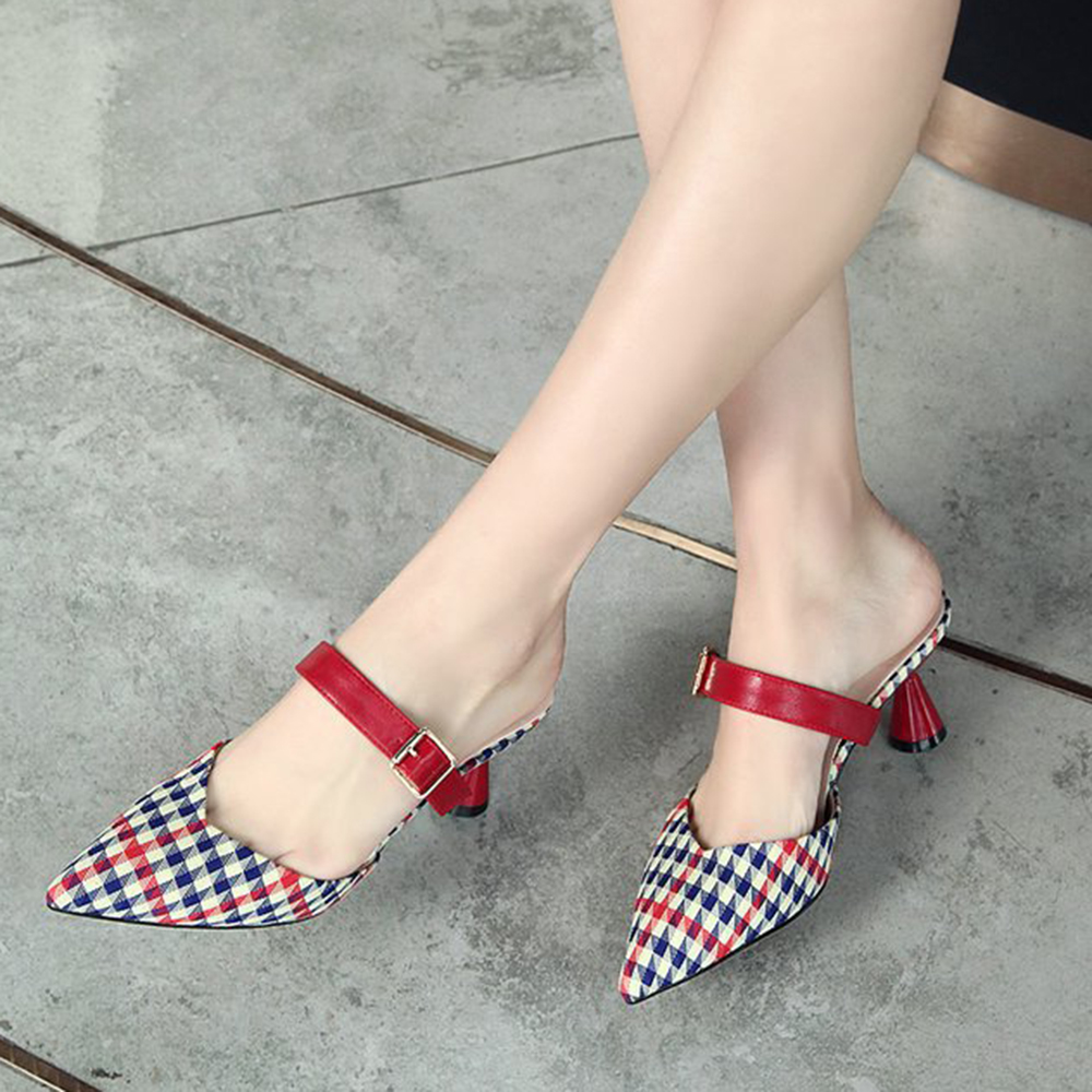 Women Retro Elegant Lattice Pattern Pointed Toe Backless Cone Heel Shoes