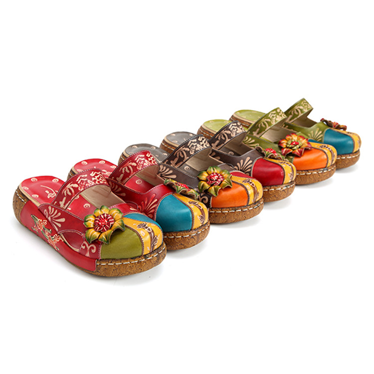 Women Genuine Leather Flower Decoration Backless Colorful Hollow Out Wedge Sandals