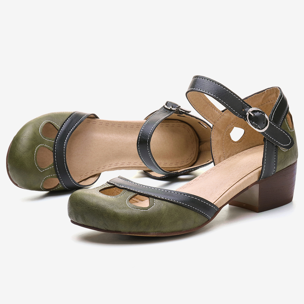 Women Hollow Out Color Stitching Plus Size Buckle Chunky Heel Casual Pumps