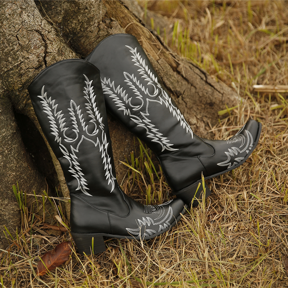 Women Large Size Retro Pointed Toe Embroidered Chunky Heel Cowboy Boots